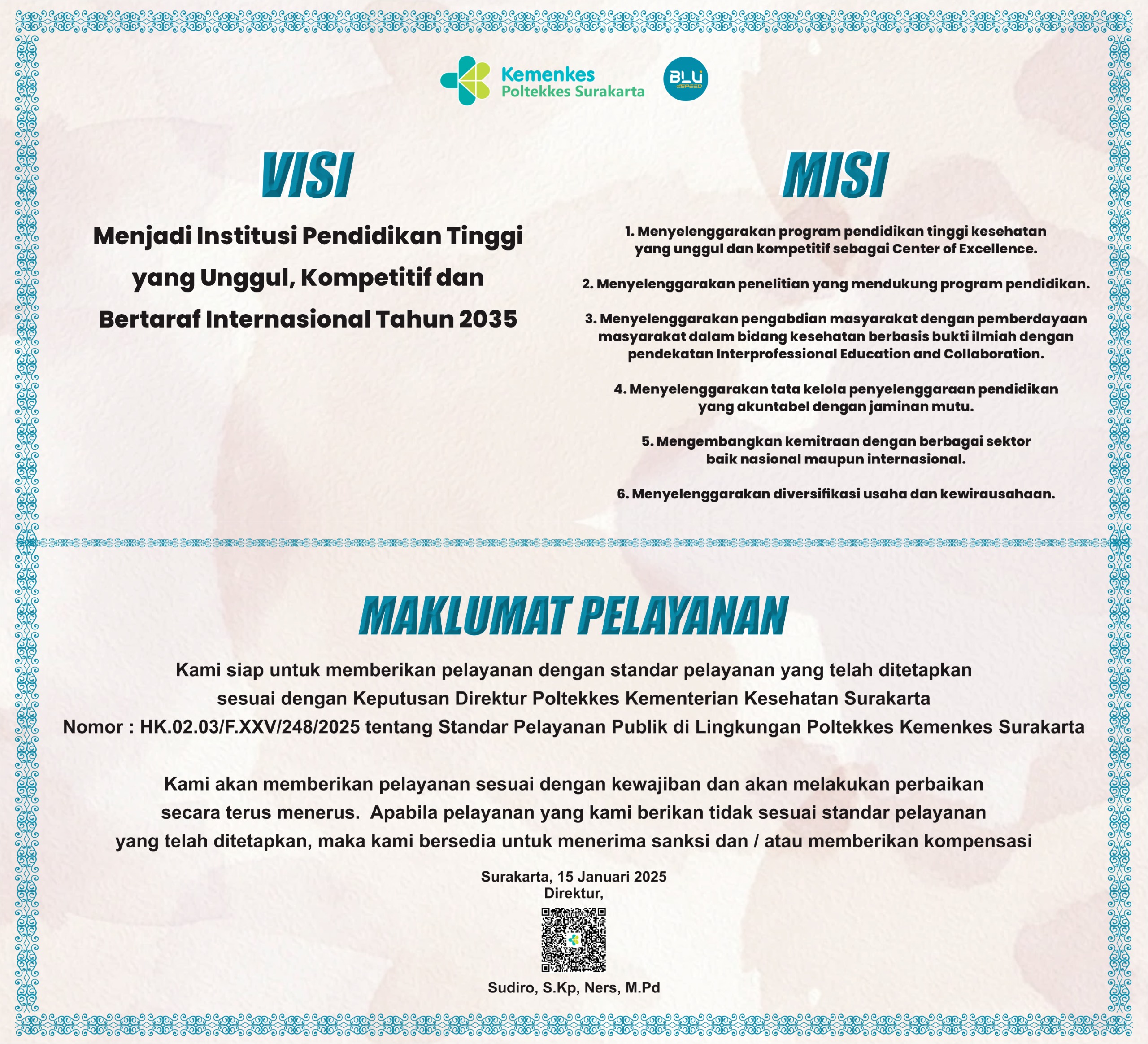 Visi "Menjadi Institusi Pendidikan Tinggi yang Unggul, Kompetitif, dan Bertaraf Internasional Tahun 2035" - Misi : -1. Menyelenggarakan program pendidikan tinggi kesehatan yang unggul dan kompetitif sebagai Center of Excellence ,-2. Menyelenggarakan penelitian yang mendukung program pendidikan ,-3. Menyelenggarakan pengabdian masyarakat dengan pemberdayaan masyarakat dalam bidang kesehatan berbasis bukti ilmiah dengan pendekatan Interprofessional Education and Collaboration ,-4. Menyelenggarakan tata kelola penyelenggaraan pendidikan yang akuntabel dengan jaminan mutu ,-5. Mengembangkan kemitraan dengan berbagai sektor, baik nasional maupun internasional ,-6. Menyelenggarakan diversifikasi usaha dan kewirausahaan