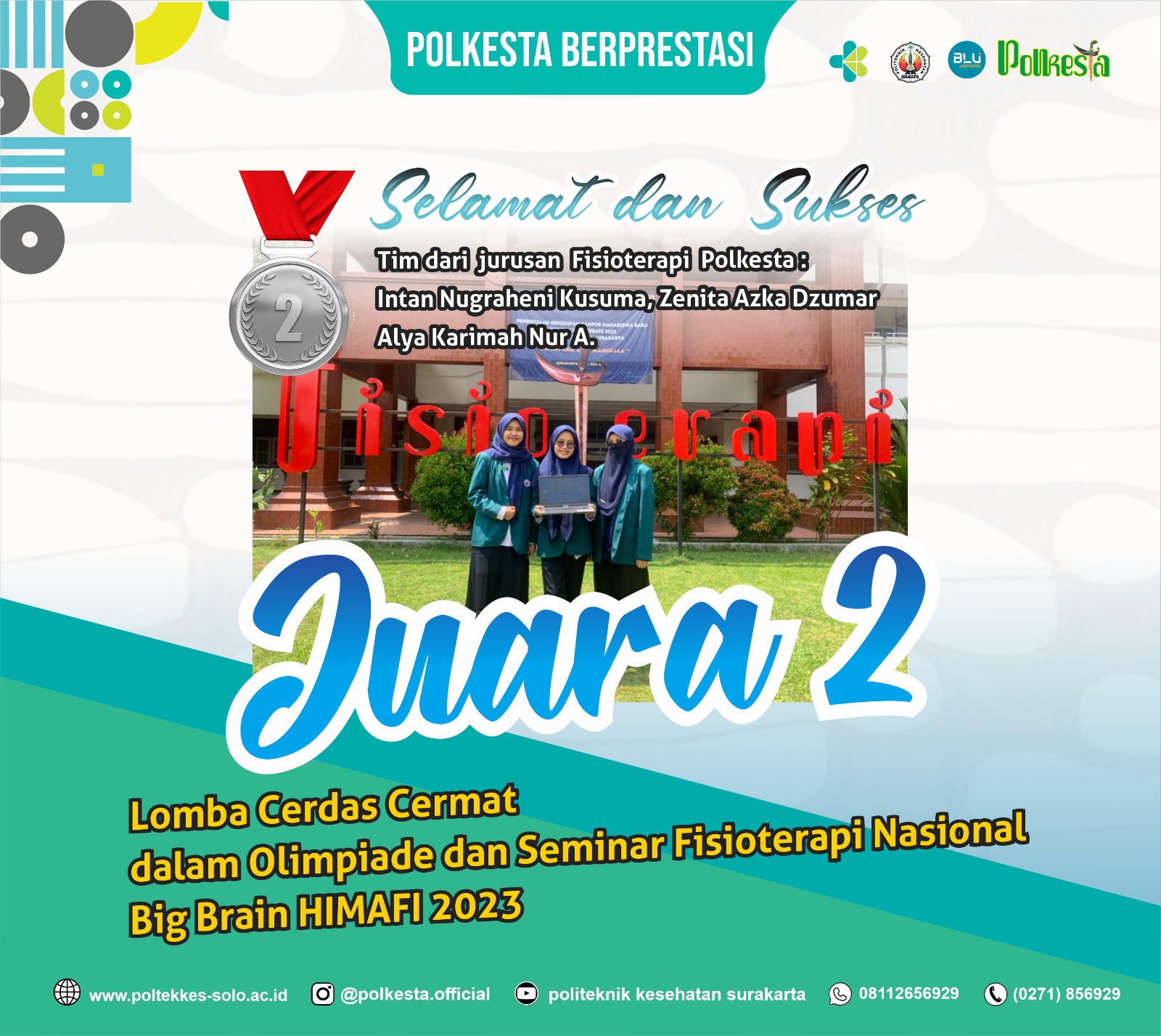 Read MoreSegenap Civitas Akademika Polkesta mengucapkan selamat dan sukses kepada tim mahasiswa jurusan Fisioterapi : Intan Nugraheni Kusuma - Kelas D4B semester 5 Zenitha Azka Dzumar - Kelas D4B semester 5 Alya Karimah Nur A - Kelas D4A semester 5 Atas prestasinya sebagai juara II Lomba Cerdas Cermat da....