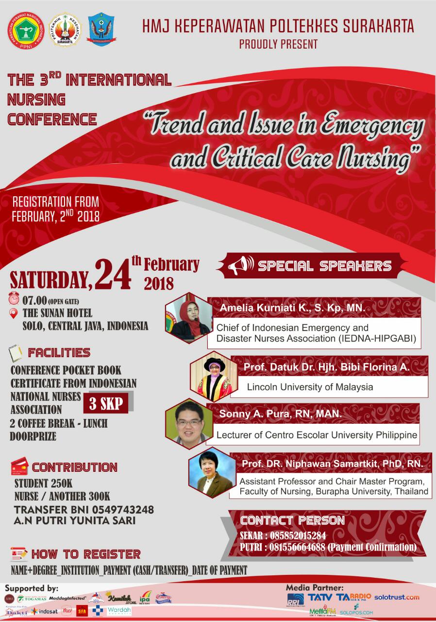 HMJ Keperawatan akan menyelenggarakan Seminar Internasional dengan topik "Trend and Issue in Emergency and Critical Care Nursing", informasi lebih lanjut dapat dilihat di pamflet berikut : .