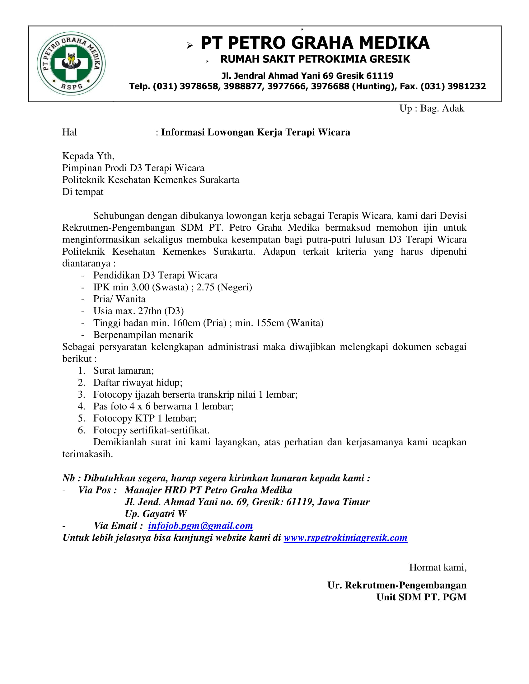 Dalam rangka memenuhi kebutuhan SDM di Jurusan Kebidanan Poltekkes Kemenkes Surakarta, bersama ini dibuka peluang untuk menjadi dosen pada jurusan tersebut.