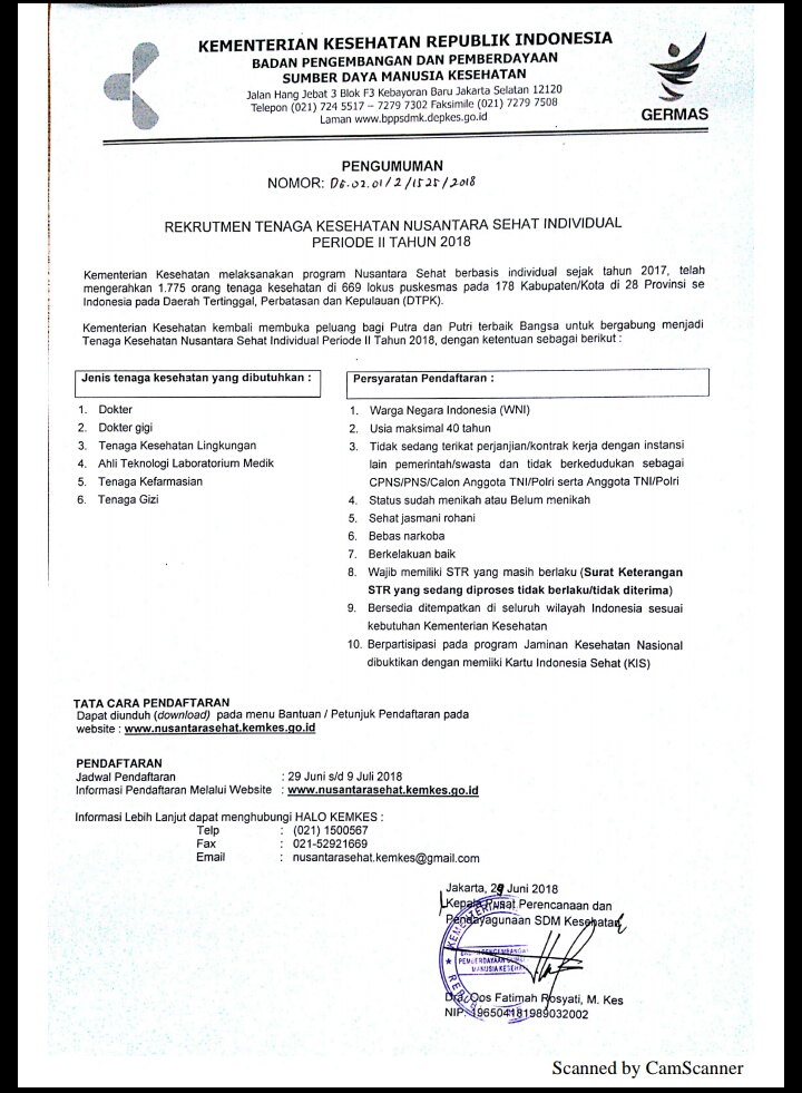 Informasi Rekrutmen Tenaga Kesehatan Nusantara Sehat Individual Periode II Tahun 2018, dapat di download pada link dibawah ini :