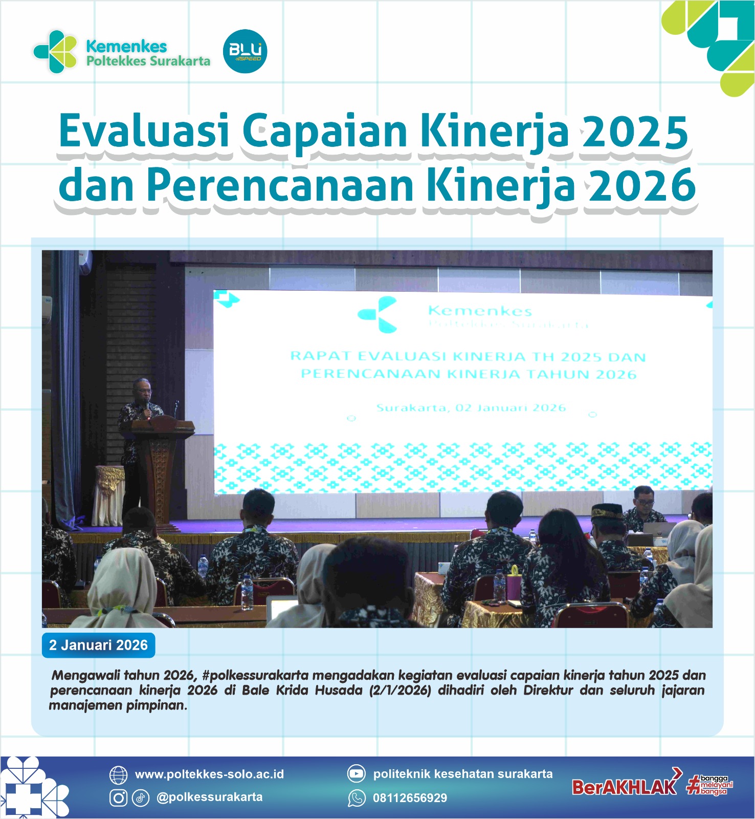 Mengawali tahun 2026, #polkessurakarta mengadakan kegiatan evaluasi capaian kinerja tahun 2025 dan perencanaan kinerja 2026 di Bale Krida Husada (2/1/2026) dihadiri oleh Direktur dan seluruh jajaran manajemen pimpinan.