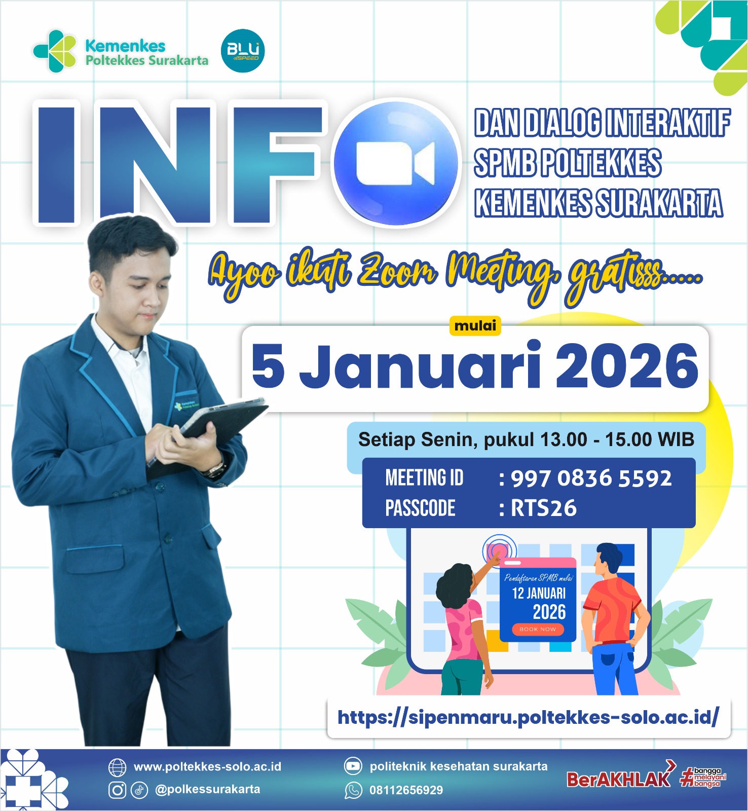 Hai Sobat #PolkesSurakarta Sebagai persiapan memasuki SPMB Poltekkes Kemenkes Surakarta TA 2026/2027 jangan lewatkan dialog interaktif seputar SPMB #PolkesSurakarta Melalui Zoom Meeting yang akan diselenggarakan mulai 5 Januari 2026 dan akan rutin diselenggarakan setiap Senin pukul 13.