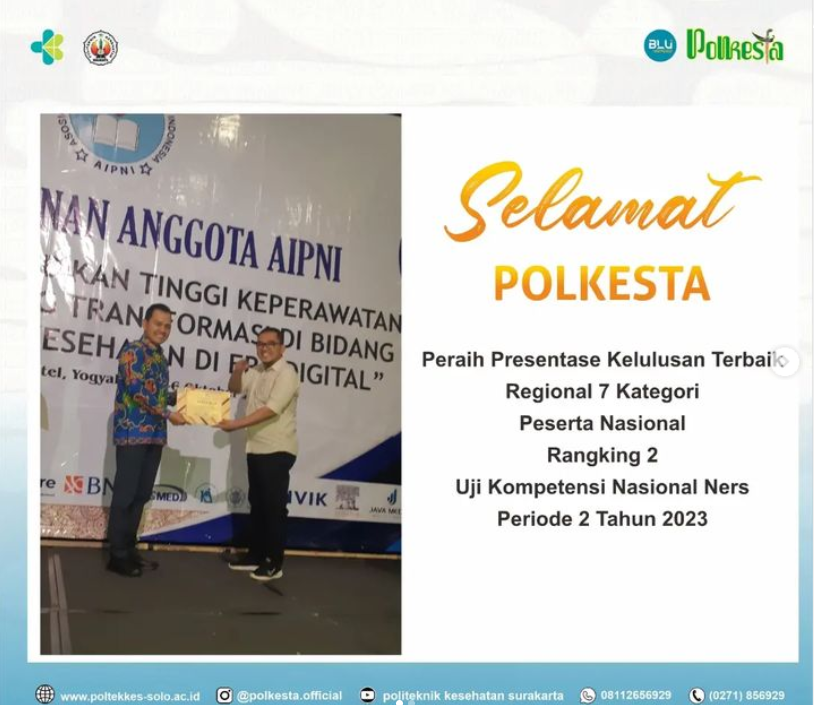 Read MoreProdi Pendidikan Profesi Ners mendapat sertifikat penghargaan dari Asosiasi Institusi Pendidikan Ners Indonesia (AIPNI) atas capaian prestasi berupa “Peraih Presentase Kelulusan Terbaik Kategori Peserta Nasional Ranking 2 (98,84%) Uji Kompetensi Nasional Ners Periode II Tahun 2023.