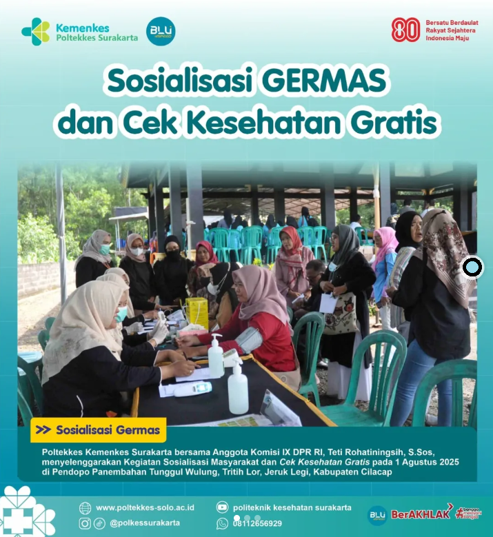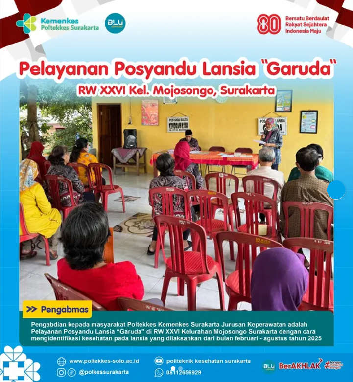 Read MorePengabdian kepada masyarakat Poltekkes Kemenkes Surakarta Jurusan Keperawatan adalah Pelayanan Posyandu Lansia “Garuda” di RW XXVI Kelurahan Mojosongo Surakarta dengan cara mengidentifikasi kesehatan pada lansia yang dilaksanakan dari bulan Februari hingga Agustus tahun 2025.