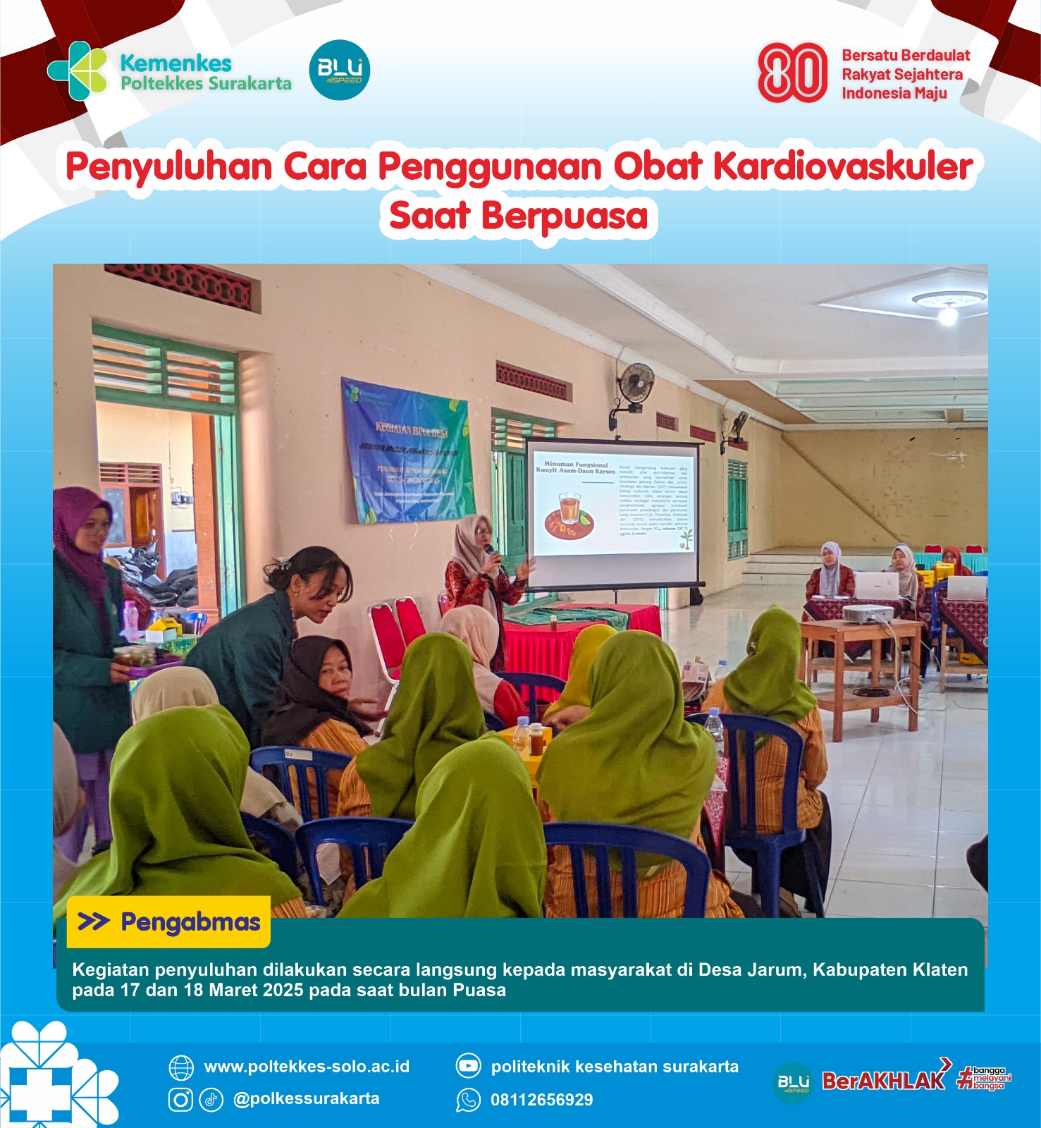 Read MoreKegiatan Pengabdian kepada Masyarakat Poltekkes Kemenkes Surakarta Jurusan Farmasi yang dilakuakan pada 17 dan 18 Maret 2025 adalah Penyuluhan Cara Penggunaan Obat Kardiovaskuler Saat Berpuasa.