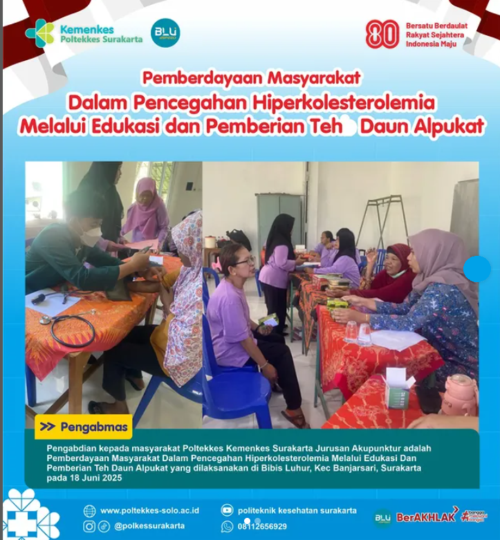 Read MorePengabdian kepada masyarakat Poltekkes Kemenkes Surakarta Jurusan Akupunktur adalah Pemberdayaan Masyarakat Dalam Pencegahan Hiperkolesterolemia Melalui Edukasi Dan Pemberian Teh Daun Alpukat yang dilaksanakan di Bibis Luhur, Kec Banjarsari, Surakarta pada 18 Juni 2025.
