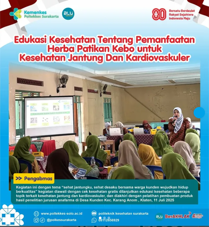 Read MorePengabdian kepada masyarakat Poltekkes Kemenkes Surakarta Jurusan Anafarma : Edukasi Kesehatan Tentang Pemanfaatan Herba Patikan Kebo Untuk Kesehatan Jantung Dan Kardiovaskuler di Desa Kunden Kecamatan Karang Anom , Klaten.