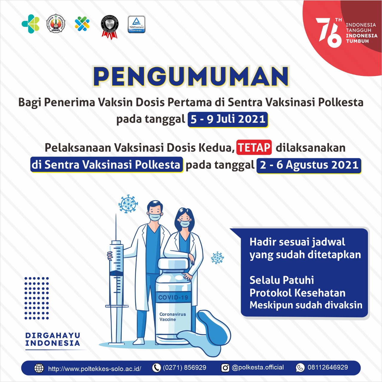 Read MoreMohon bagi peserta Vaksin Dosis I tanggal 5 - 9 Juli 2021 di Sentra Vaksin Polkesta, untuk bisa hadir kembali untuk Vaksin Dosis II di Sentra Vaksin Polkesta pada Tanggal 2 - 6 Agustus 2021 TETAP PATUHI PROTOKOL KESEHATAN .