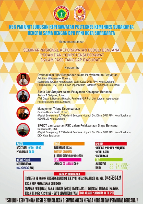 Read MoreKSR PMI unit Jurusan Keperawatan POLTEKKES KEMENKES Surakarta bekerja sama dengan DPD PPNI Kota Surakarta Proudly Present: Seminar Nasional Keperawatan Peduli Bencana dengan tema "Peran dan Kompetensi Perawat Dalam Fase Tanggap Darurat" Speaker: 1.