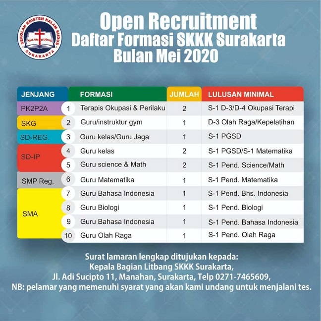 Lowongan Pekerjaan Sekolah Kristen Kalam Kudus Surakarta : .