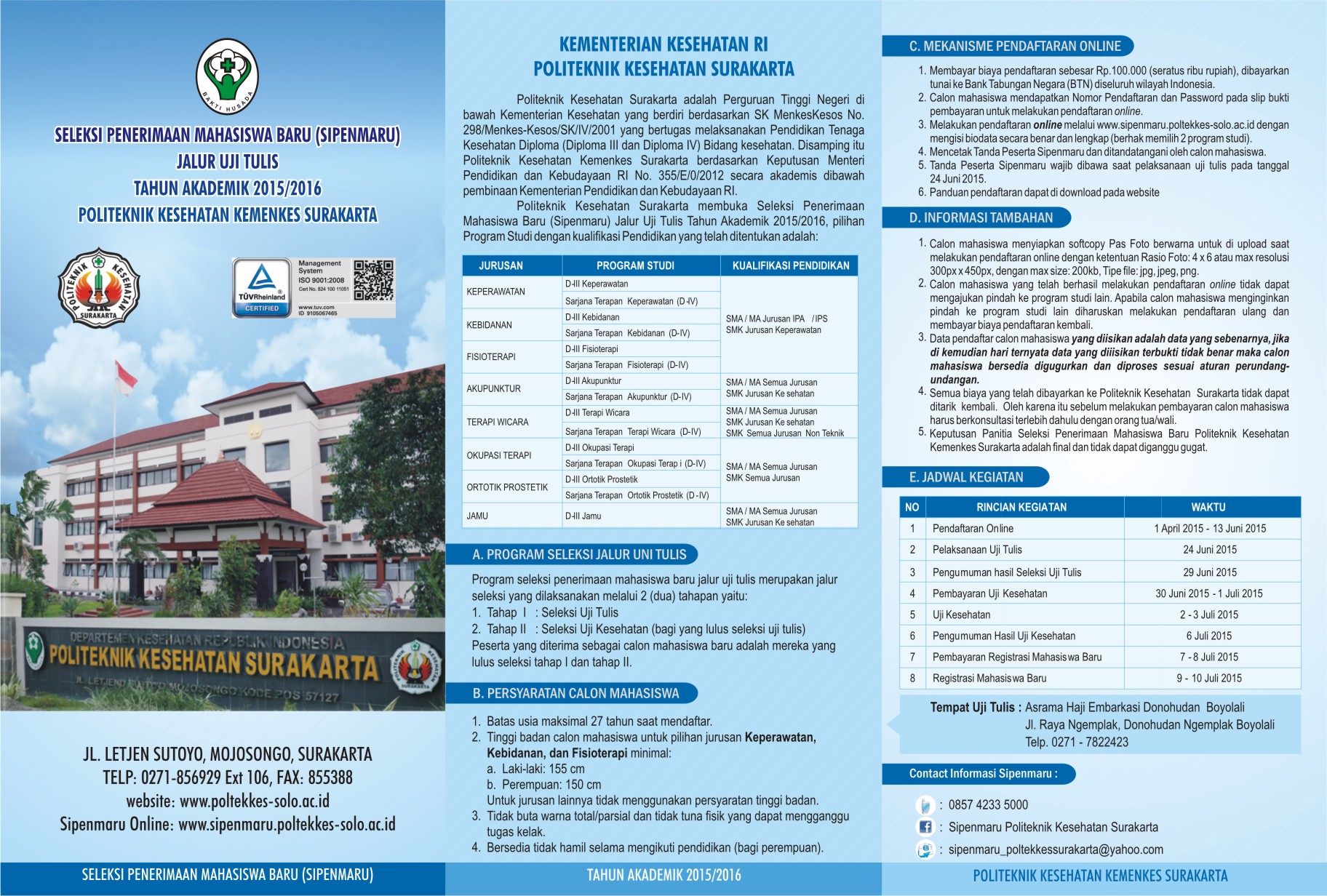 Read MoreBersama ini kami sampaikan daftar nama-nama yang dinyatakan lulus pada uji kesehatan di masing-masing program studi pada seleksi penerimaan mahasiswa baru jalur uji tulis Poltekkes Kemenkes Surakarta tahun 2015/2016.