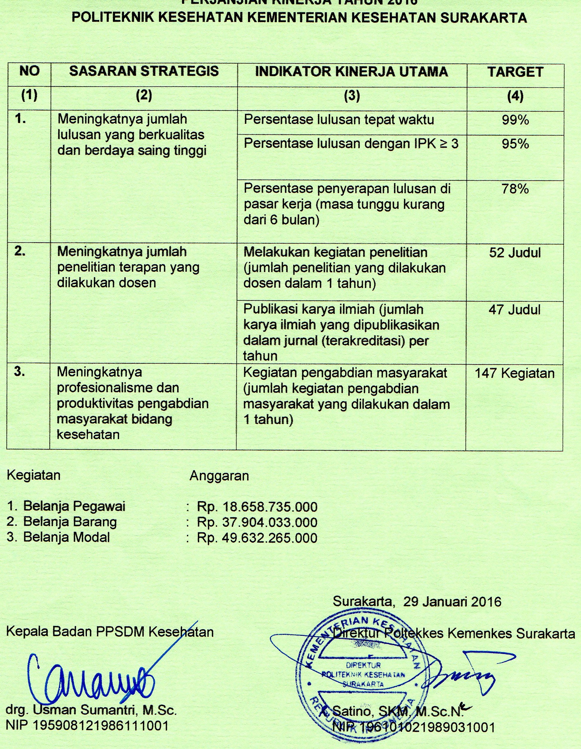 PERJANJIAN KINERJA POLTEKKES SURAKARTA TH 2016