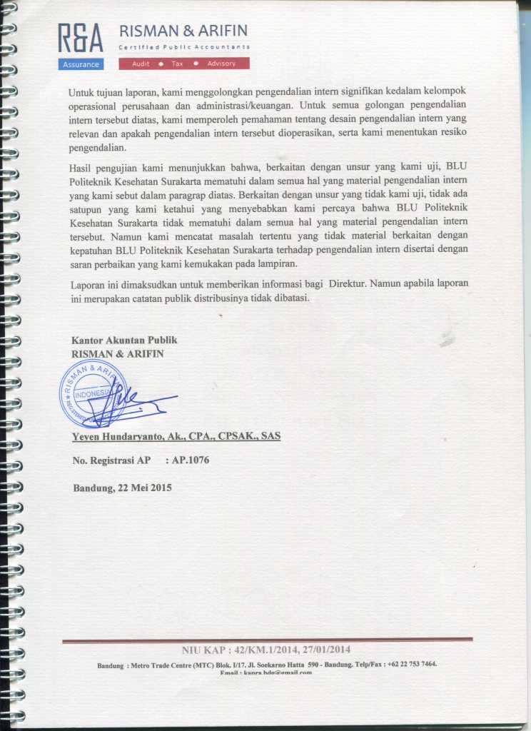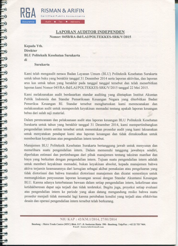 Foto LAPORAN AUDITOR INDEPENDEN ATAS KEPATUHAN BLU POLTEKKES KEMENKES SURAKARTA TAHUN 2014