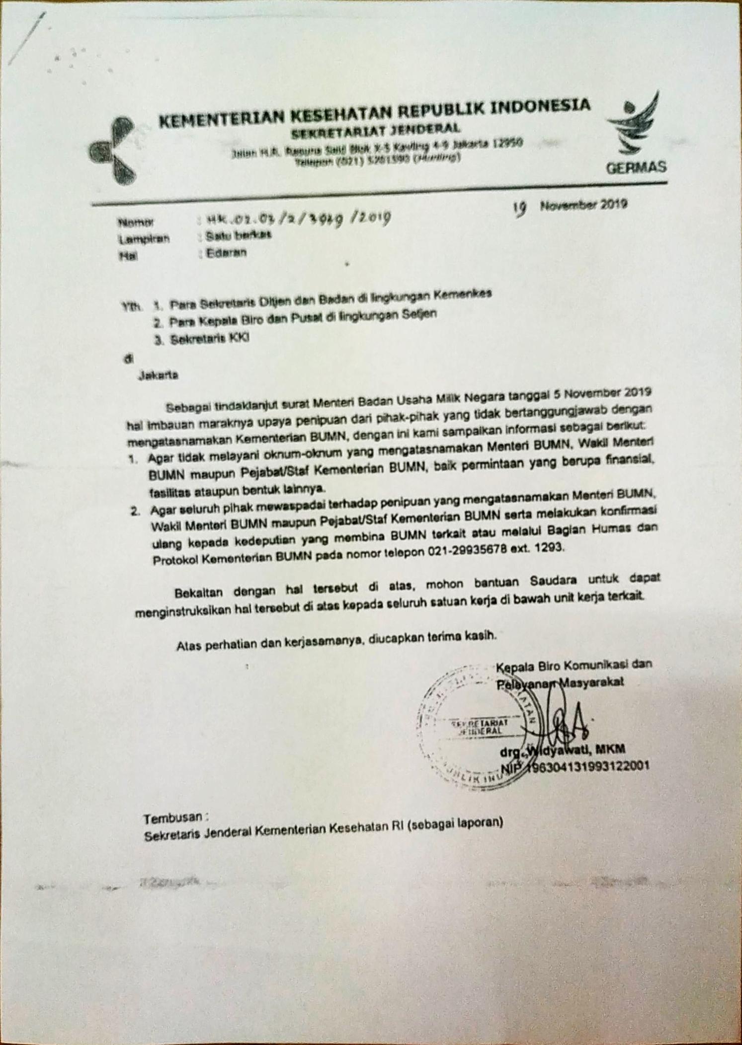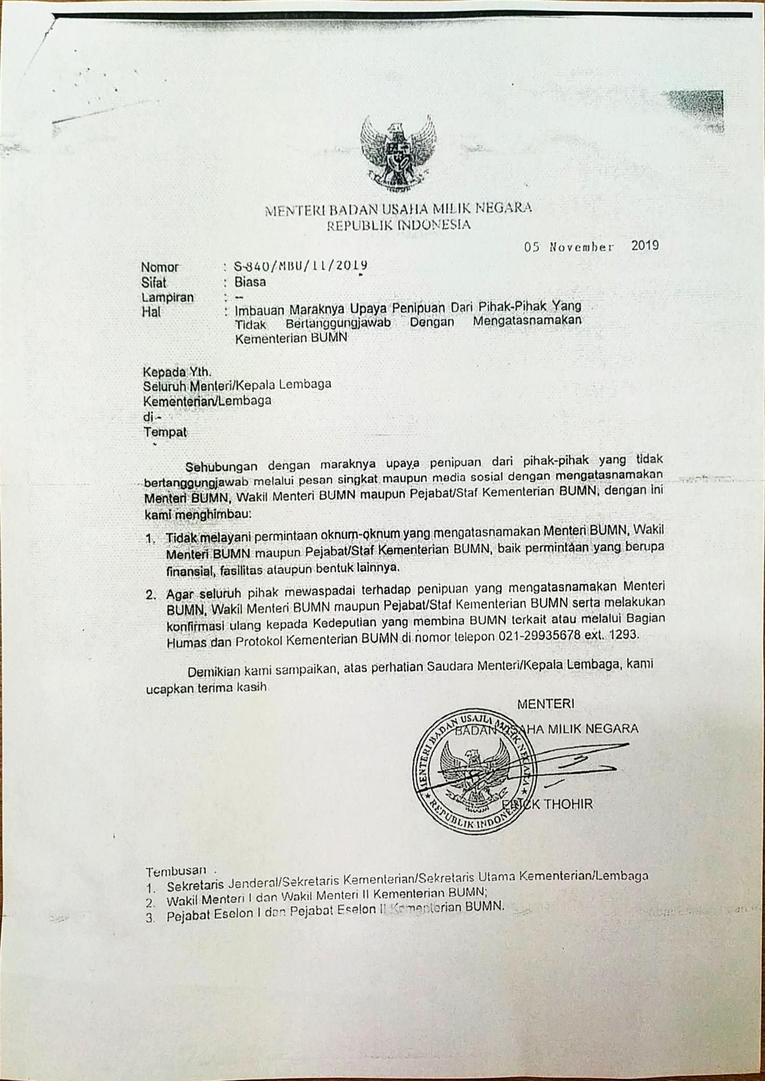 1. Imbauan dari Menteri BUMN RI tentang Maraknya Upaya Penipuan Mengatasnakaman Kementerian BUMN