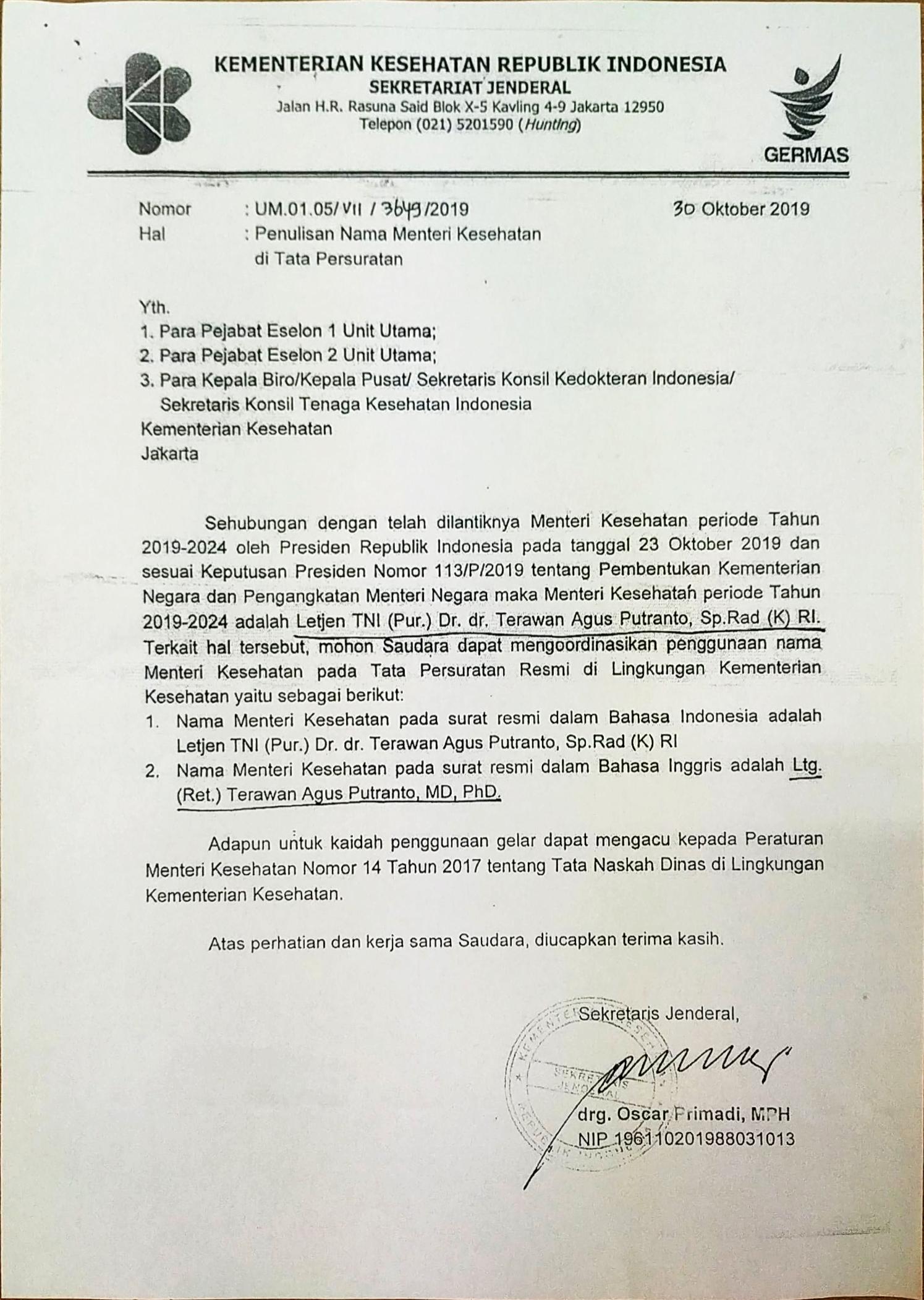 4. Surat Edaran Sekretariat Jenderal Kemenkes RI tentang Penulisan Nama Menteri Kesehatan RI di Tata Persuratan