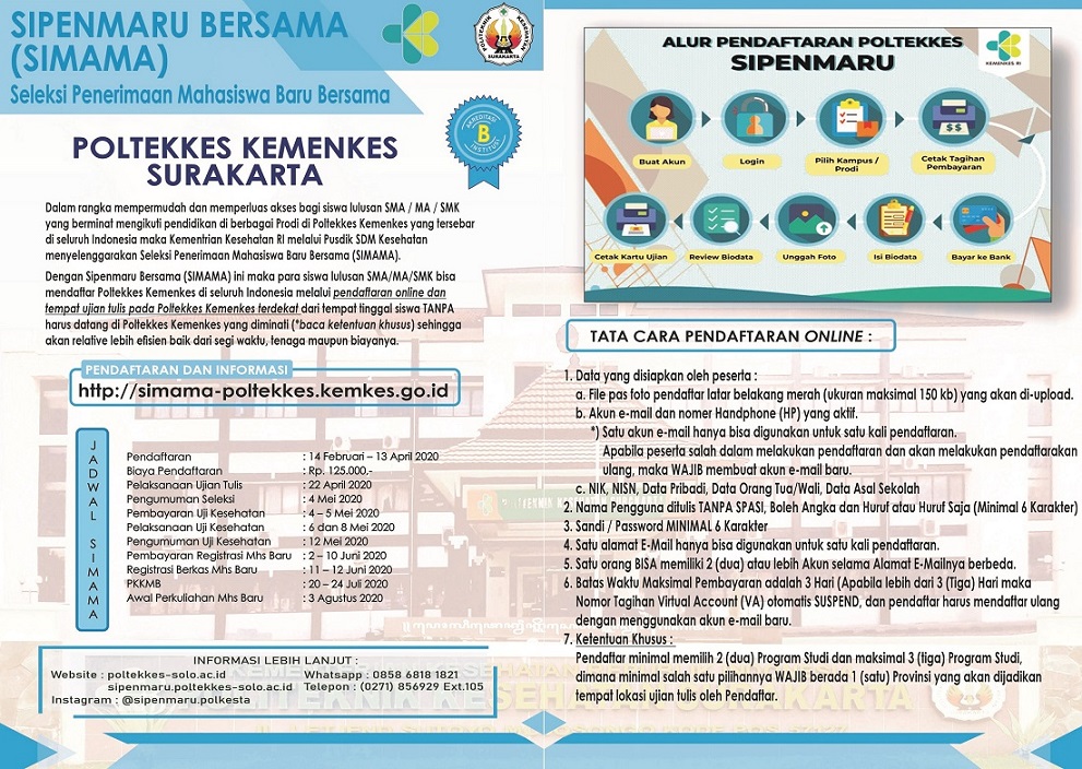 Read MorePENDAFTARAN SELEKSI PENERIMAAN MAHASISWA BARU BERSAMA (SIMAMA) DAPAT DIAKSES MELALUI ALAMAT : http://simama-poltekkes.
