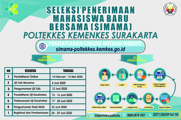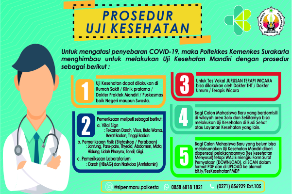 Read MoreDiberitahukan kepada seluruh peserta uji kesehatan calon mahasiswa baru Jalur PMDP Poltekkes Kemenkes Surakarta bahwa dengan mempertimbangkan keadaan darurat bencana Covid 19, maka Pelaksanaan Uji Kesehatan yang sebelumnya akan dilakukan pada tanggal 3 dan 4 April 2020 bertempat di Kampus I Poltek....