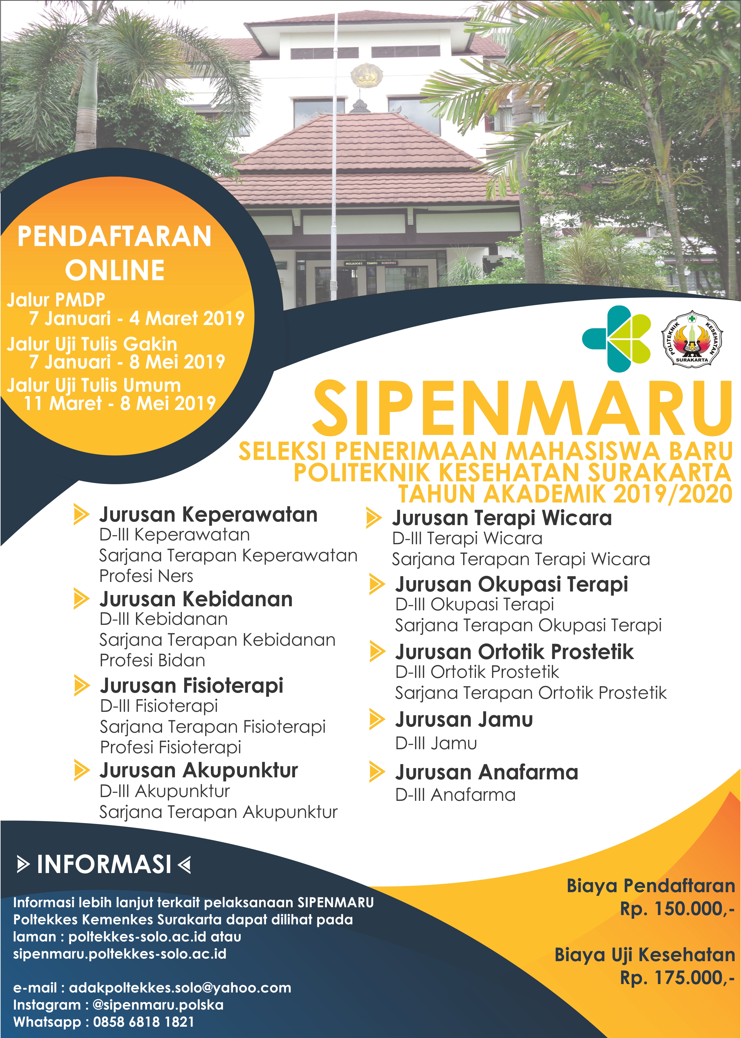 Memasuki Tahun Akademik 2019/2020 Politeknik Kesehatan Surakarta membuka pendaftaran bagi lulusan SMA/MA/SMK untuk Program Diploma Tiga, Sarjana Terapan dan Sarjana Terapan Berlanjut Profesi melalui jalur Uji Tulis Umum.